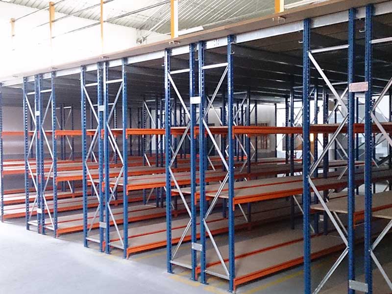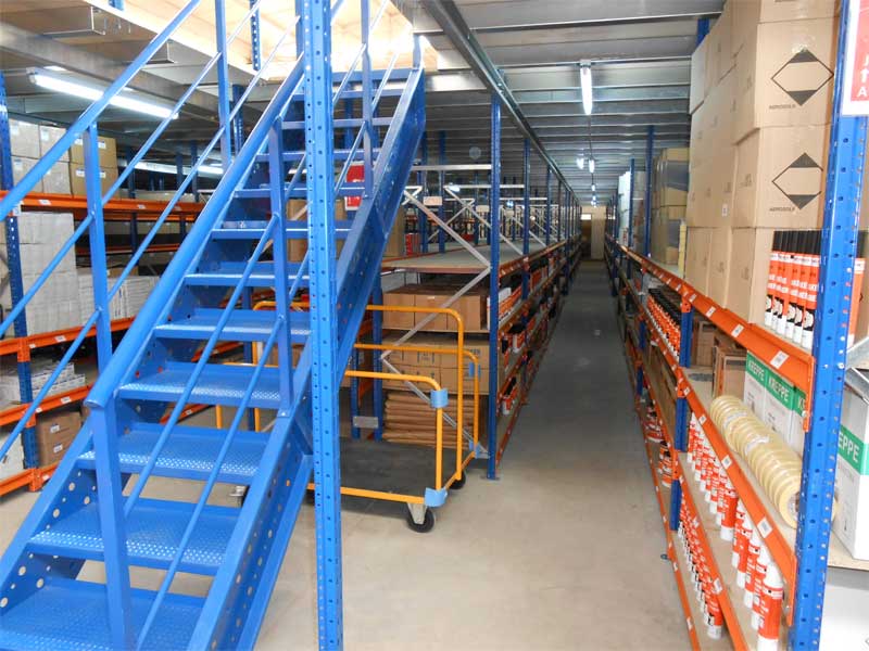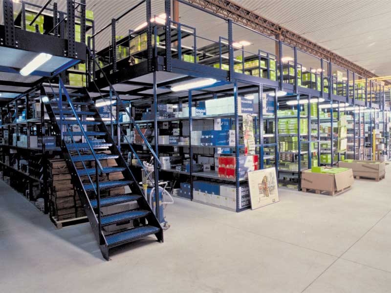 Estruturas metálicas modulares que criam pisos intermédios e otimizam o espaço vertical do armazém. Integram-se com racks e aumentam a capacidade de armazenagem.